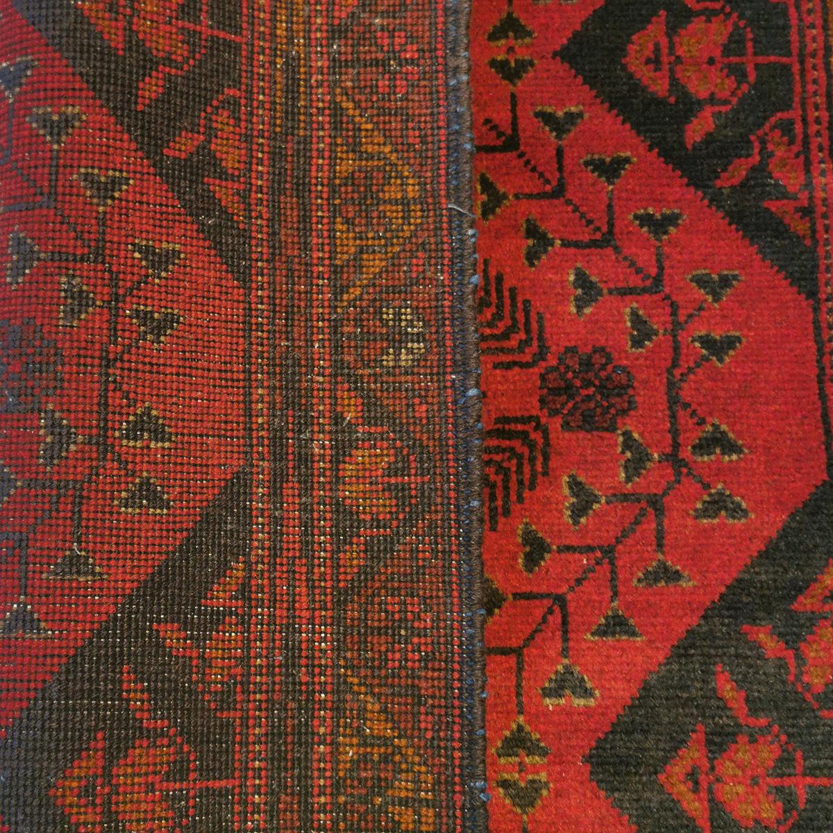 Afghan-Khal tepper har en karakteristisk rød fargepalett og detaljerte geometriske mønstre. De er ofte tett knyttet, noe som gir en jevn og slitesterk overflate. Designet er inspirert av tradisjonelle afghanske motiver, noe som gjør teppene tidløse og allsidige i både klassiske og moderne rom.