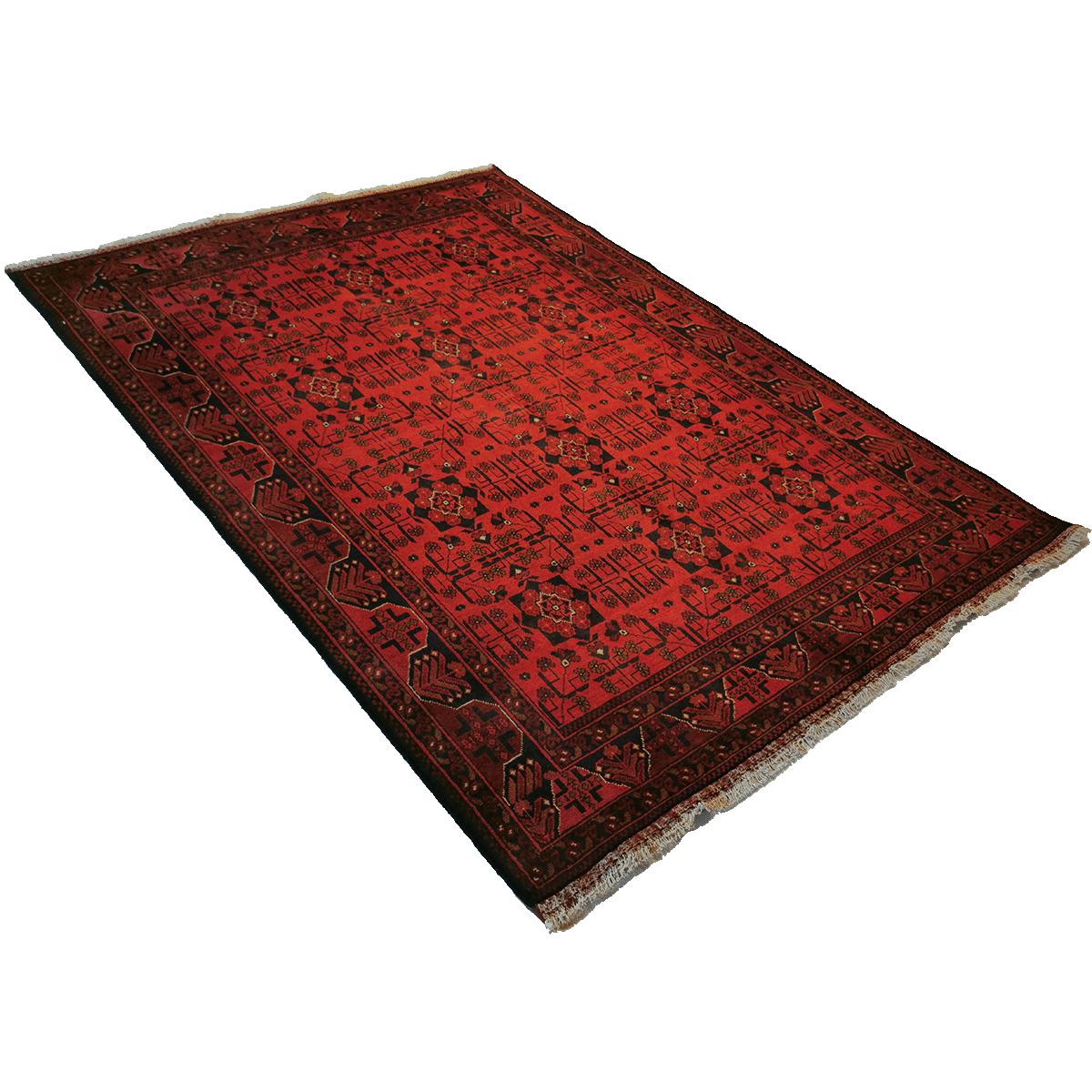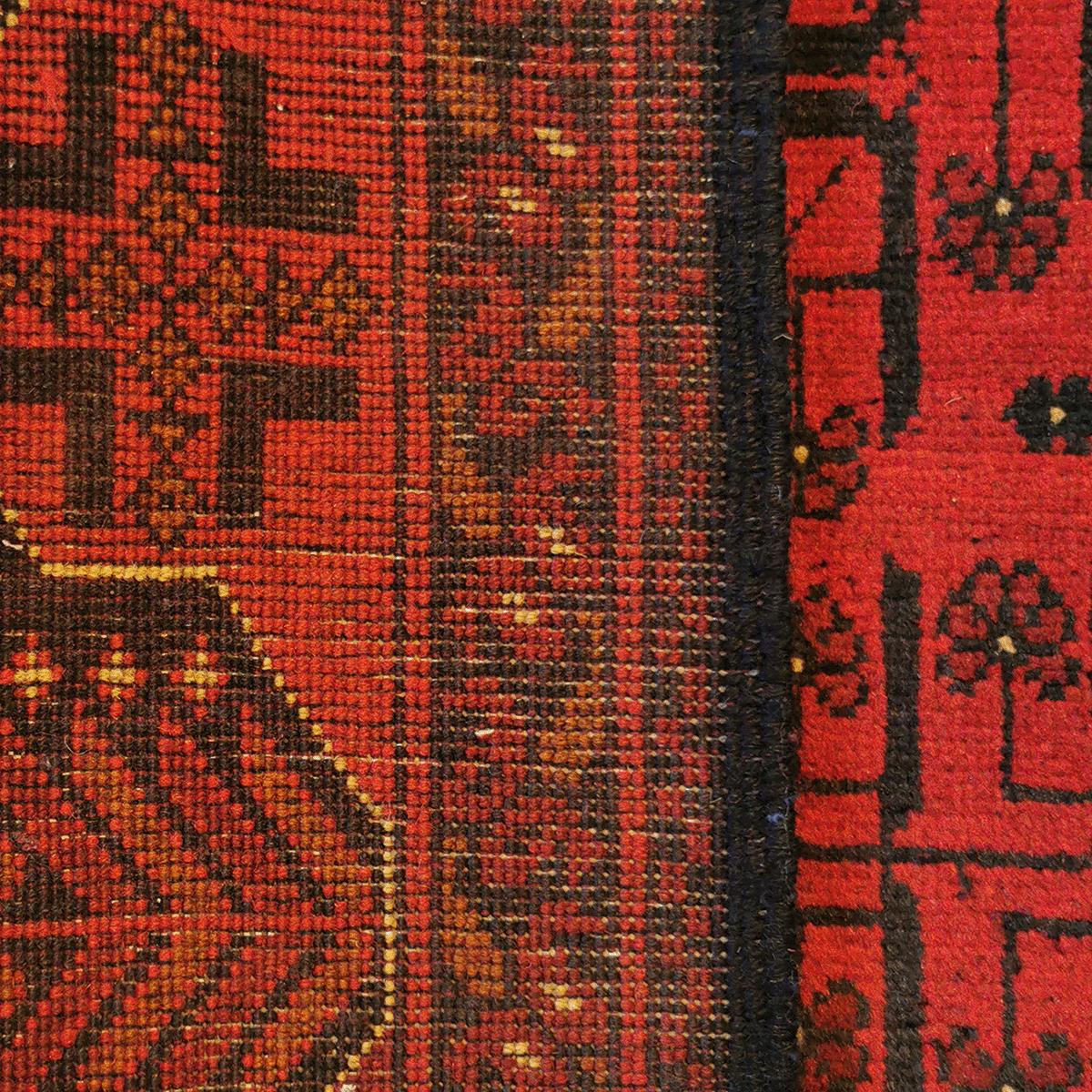 Afghan-Khal tepper har en karakteristisk rød fargepalett og detaljerte geometriske mønstre. De er ofte tett knyttet, noe som gir en jevn og slitesterk overflate. Designet er inspirert av tradisjonelle afghanske motiver, noe som gjør teppene tidløse og allsidige i både klassiske og moderne rom.