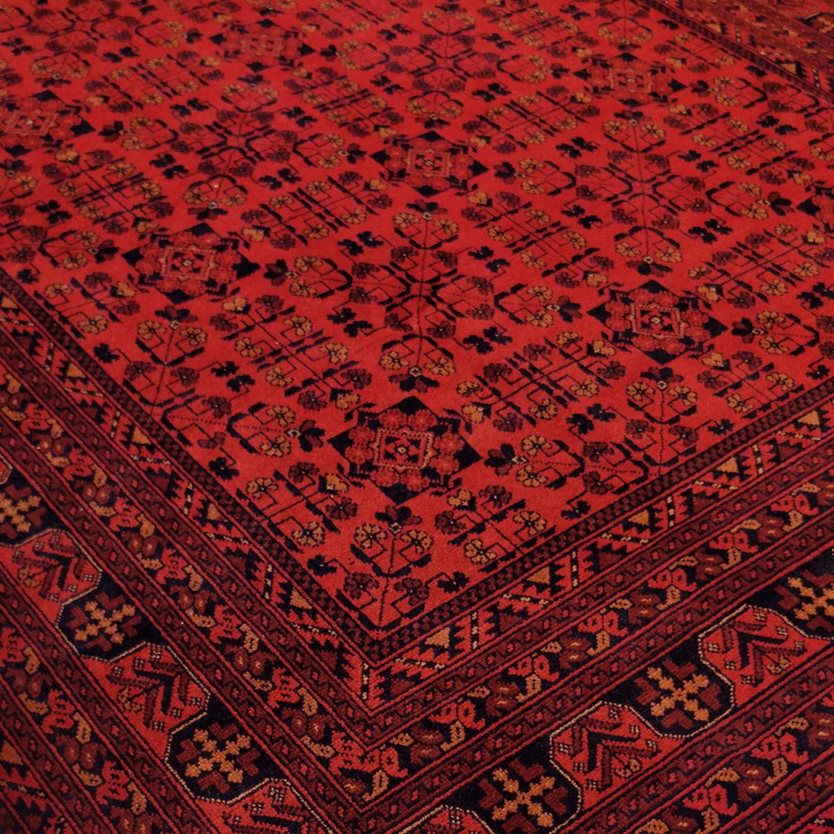 Afghan-Khal tepper har en karakteristisk rød fargepalett og detaljerte geometriske mønstre. De er ofte tett knyttet, noe som gir en jevn og slitesterk overflate. Designet er inspirert av tradisjonelle afghanske motiver, noe som gjør teppene tidløse og allsidige i både klassiske og moderne rom.