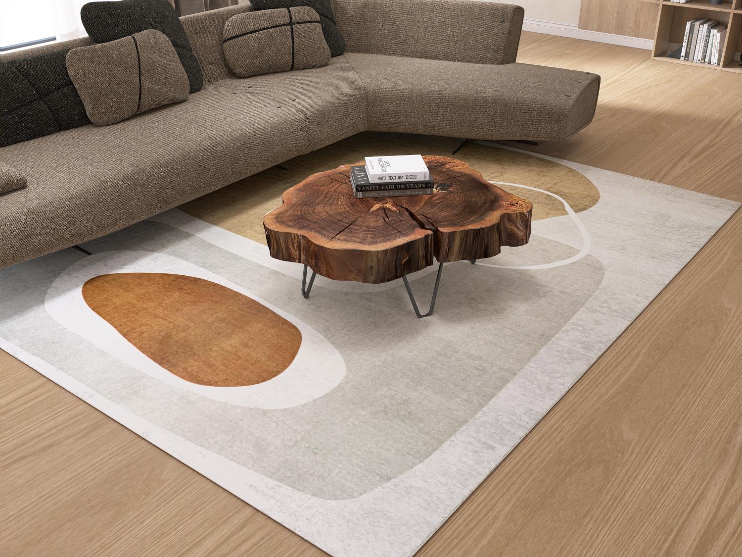 Canyon har et moderne, abstrakt design med myke, avrundede former i varme beige- og sandtoner, kombinert med lys grå og dype brune innslag. Den lyse, organiske linjen som beveger seg gjennom mønsteret skaper flyt og gir teppet et rolig, balansert uttrykk som tilfører rommet karakter uten å dominere.