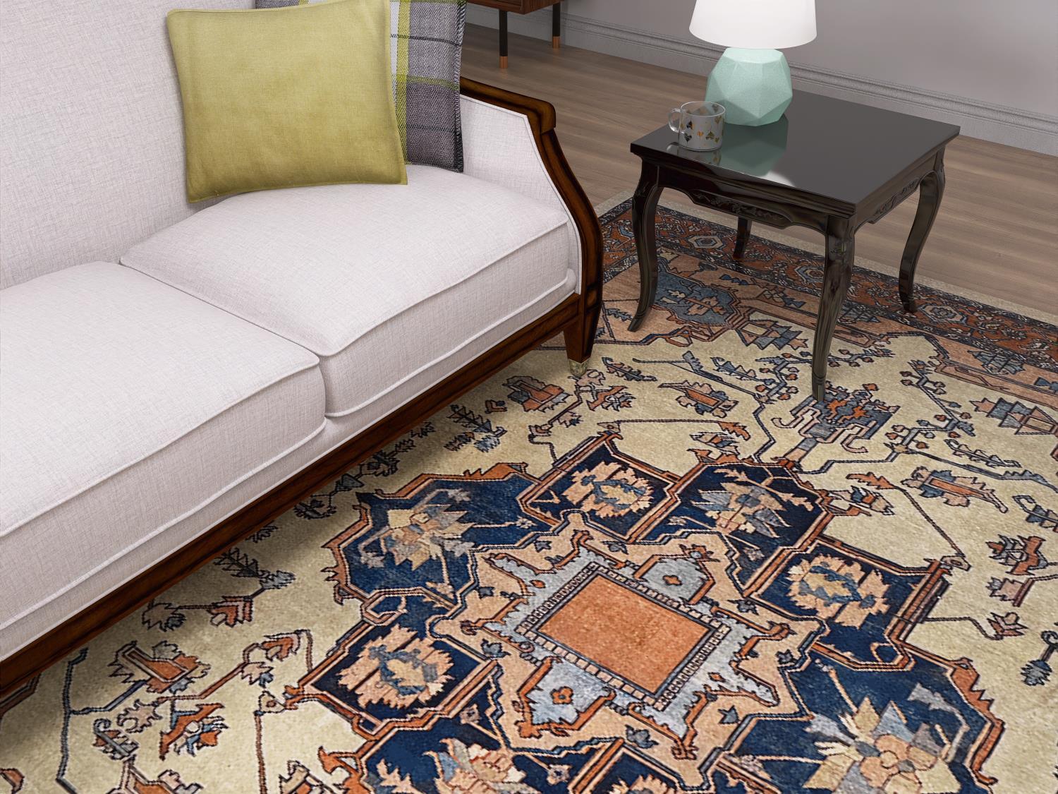 Caspian har et orientalsk og vintage-inspirert design med en klassisk medaljong i sentrum og rikt detaljerte border. Fargepaletten kombinerer en mintfarget bunn med dype blåtoner og varme rust- og terrakottanyanser, noe som gir teppet et tidløst og karakterfullt uttrykk. De tradisjonelle mønstrene tilfører rommet dybde og eleganse uten å virke tungt.
