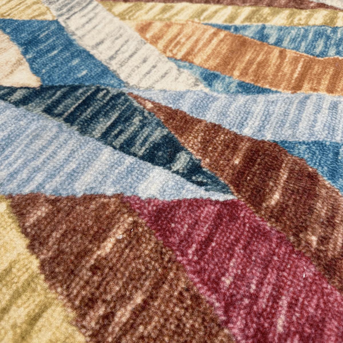 Diamant har et livlig og moderne uttrykk med et gjentakende, geometrisk mønster inspirert av diamantformer og flettede linjer. Fargepaletten kombinerer varme toner som rust, oker og burgunder med kjølige innslag av blått og lyse nøytrale nyanser. Dette gir teppet et energisk, men balansert preg som tilfører rommet personlighet og dybde.