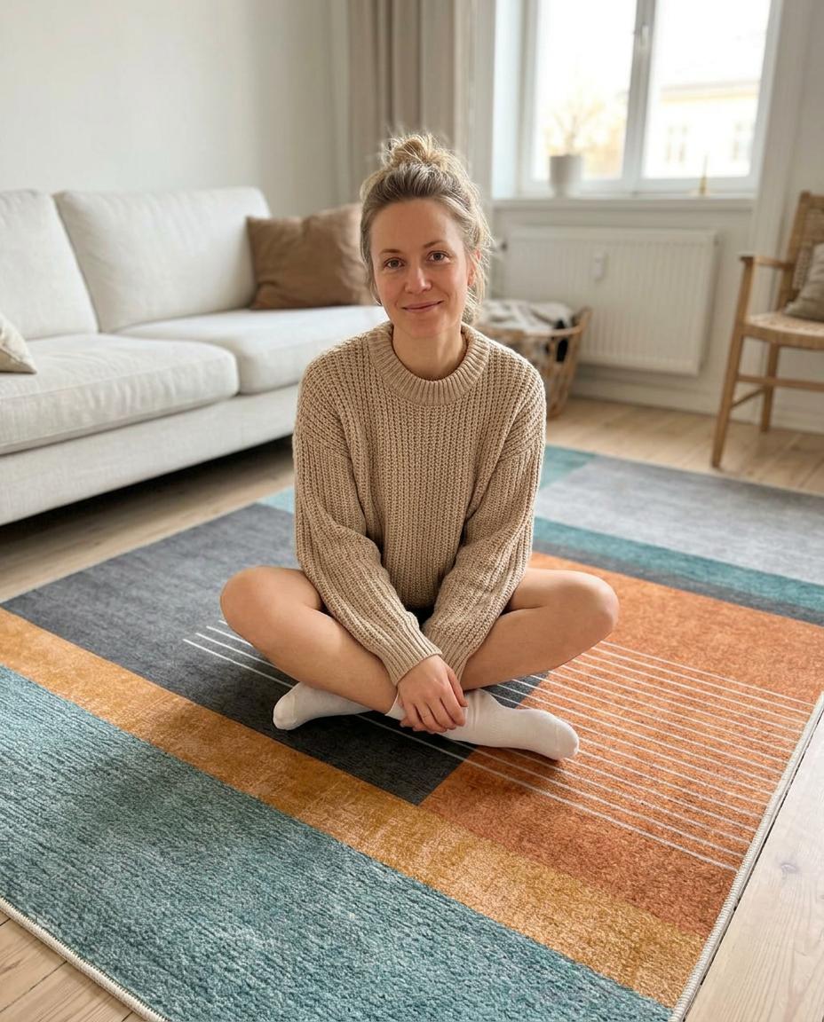 Teppet kan vaskes i vaskemaskin på 30°, noe som gjør det praktisk i hverdagen og godt egnet for rom med normal bruk. På undersiden har Funka integrert anti-skli som bidrar til at teppet ligger stabilt på gulvet uten behov for ekstra underlag.