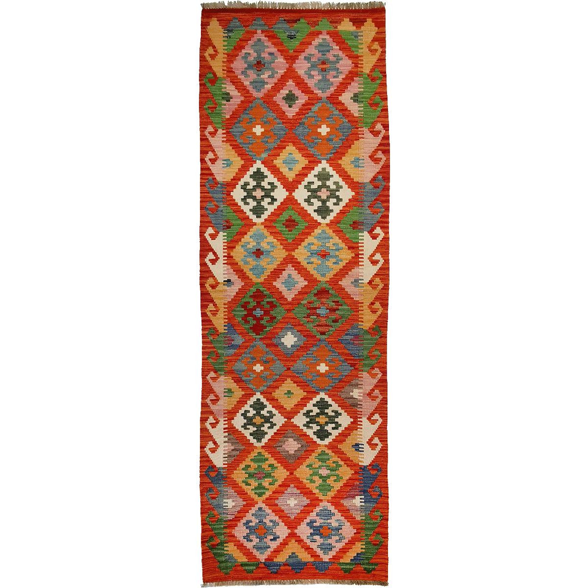 Afghanske kelimer er håndvevde tepper med sterke, geometriske mønstre og rike farger. De lages tradisjonelt i Afghanistan, ofte av ull, og har en karakteristisk flatt vevd struktur uten lugg. Mønstrene kan variere fra enkle design til mer intrikate motiver, og kelimene er kjent for sin rustikke, autentiske stil som passer godt inn i både tradisjonelle og moderne interiør. Disse kelimene er vendbare og kan brukes på begge sider.