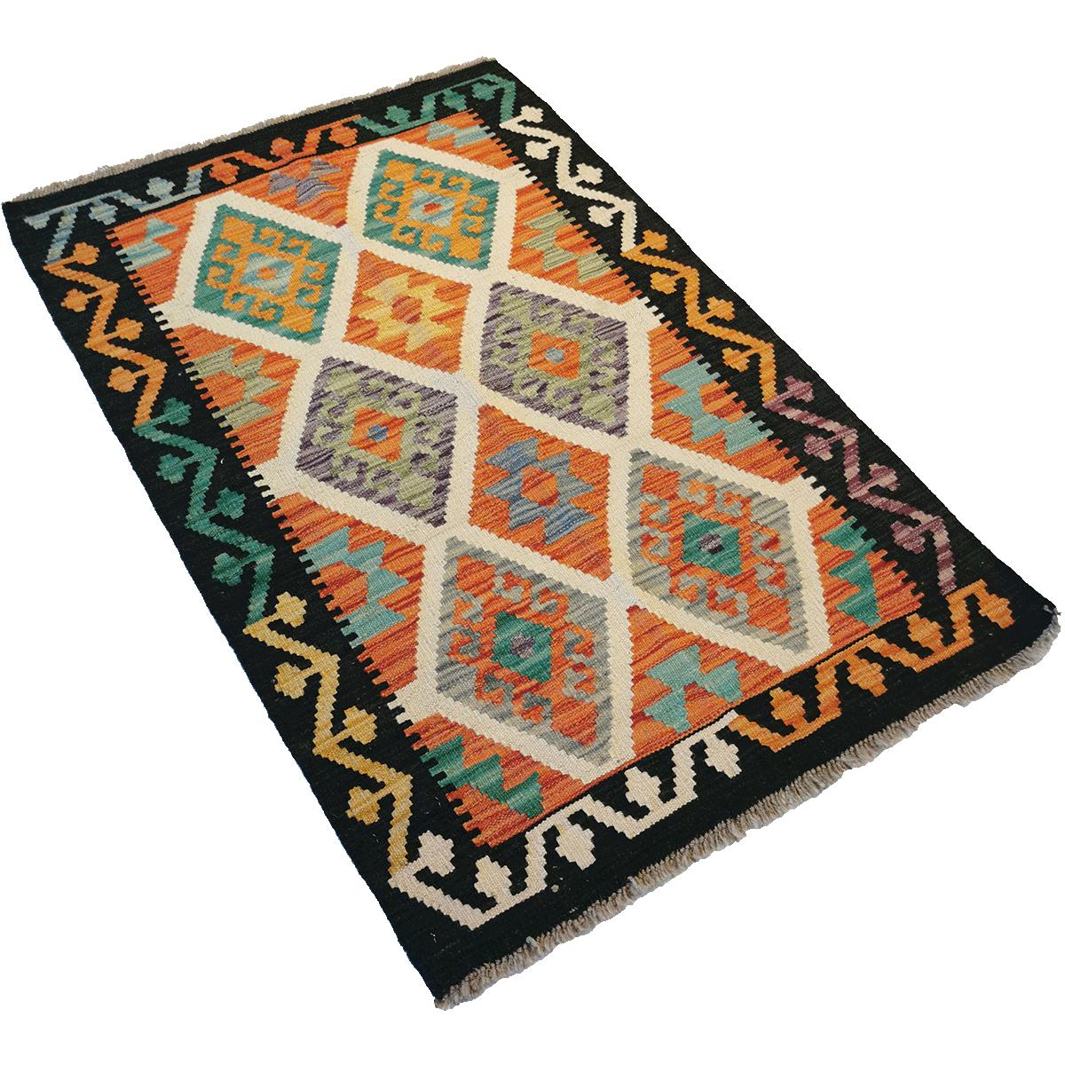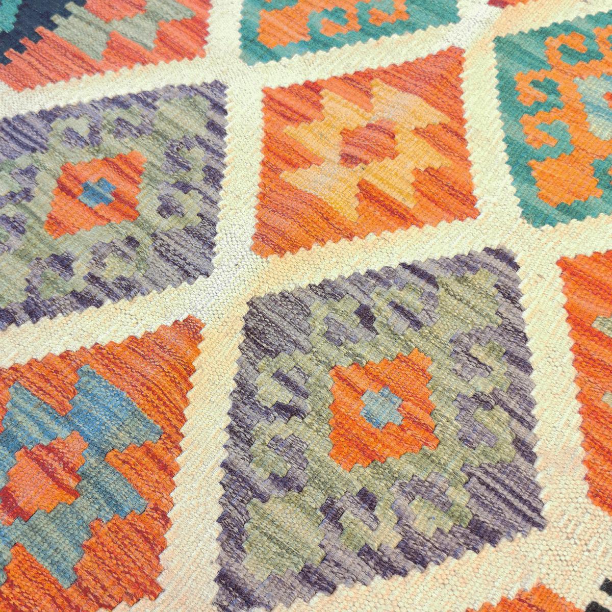 Afghanske kelimer er håndvevde tepper med sterke, geometriske mønstre og rike farger. De lages tradisjonelt i Afghanistan, ofte av ull, og har en karakteristisk flatt vevd struktur uten lugg. Mønstrene kan variere fra enkle design til mer intrikate motiver, og kelimene er kjent for sin rustikke, autentiske stil som passer godt inn i både tradisjonelle og moderne interiør. Disse kelimene er vendbare og kan brukes på begge sider.