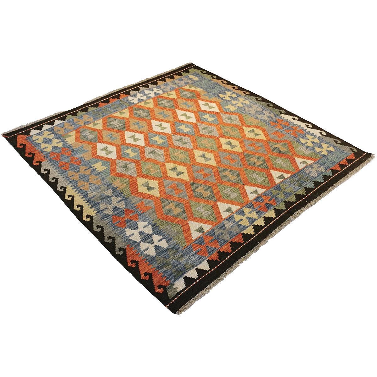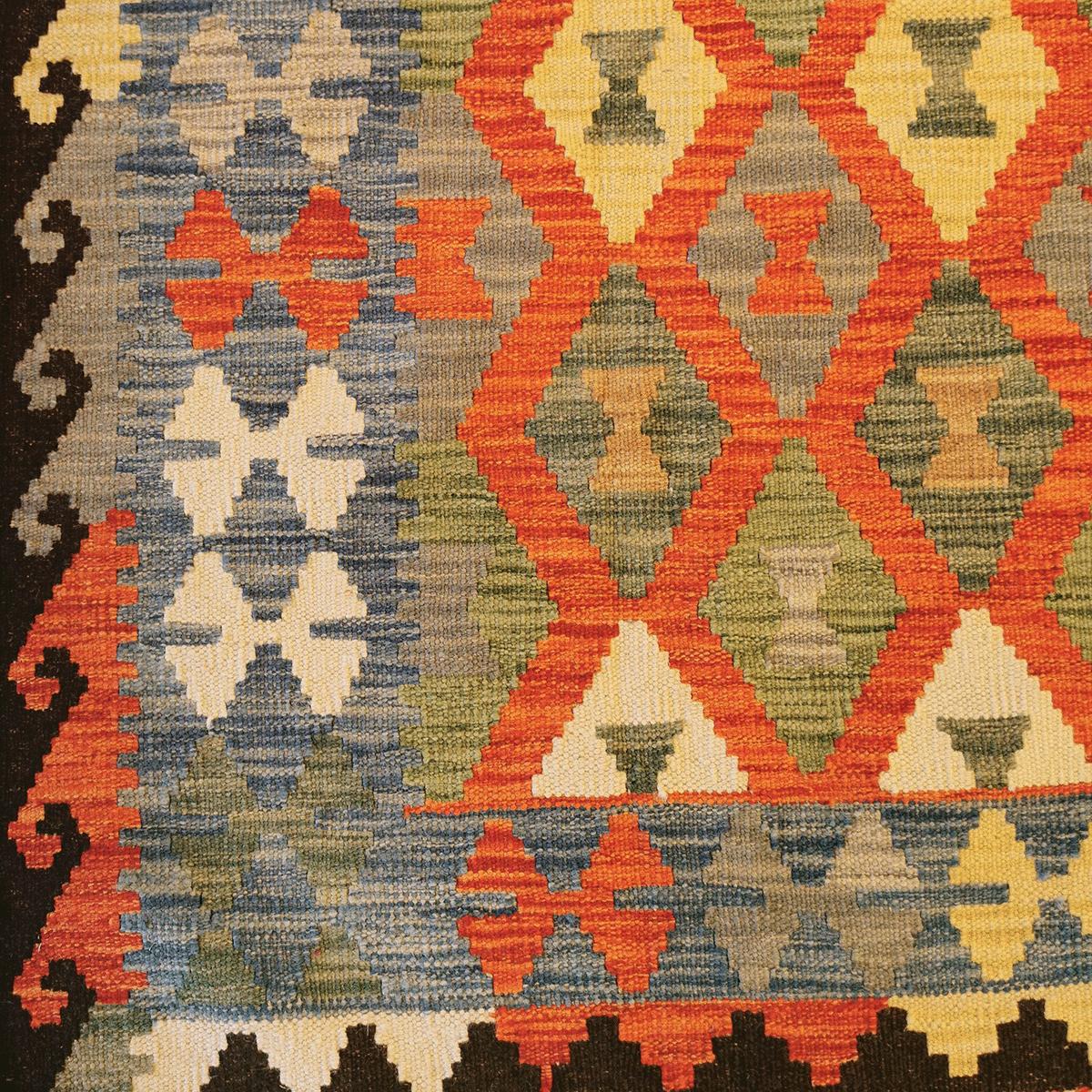 Afghanske kelimer er håndvevde tepper med sterke, geometriske mønstre og rike farger. De lages tradisjonelt i Afghanistan, ofte av ull, og har en karakteristisk flatt vevd struktur uten lugg. Mønstrene kan variere fra enkle design til mer intrikate motiver, og kelimene er kjent for sin rustikke, autentiske stil som passer godt inn i både tradisjonelle og moderne interiør. Disse kelimene er vendbare og kan brukes på begge sider.