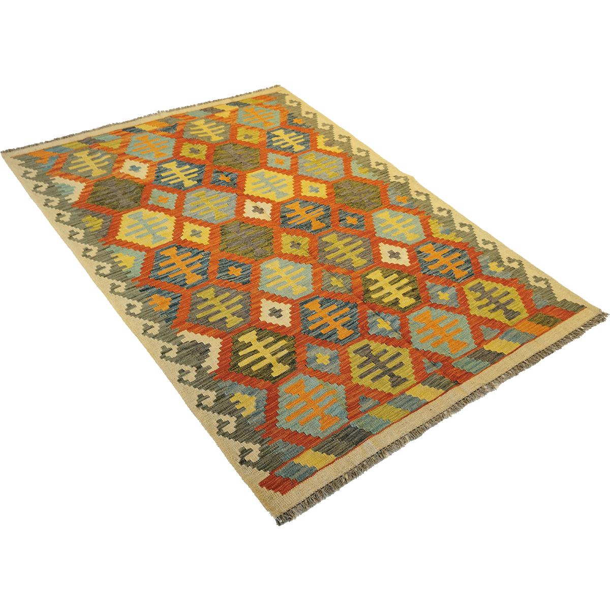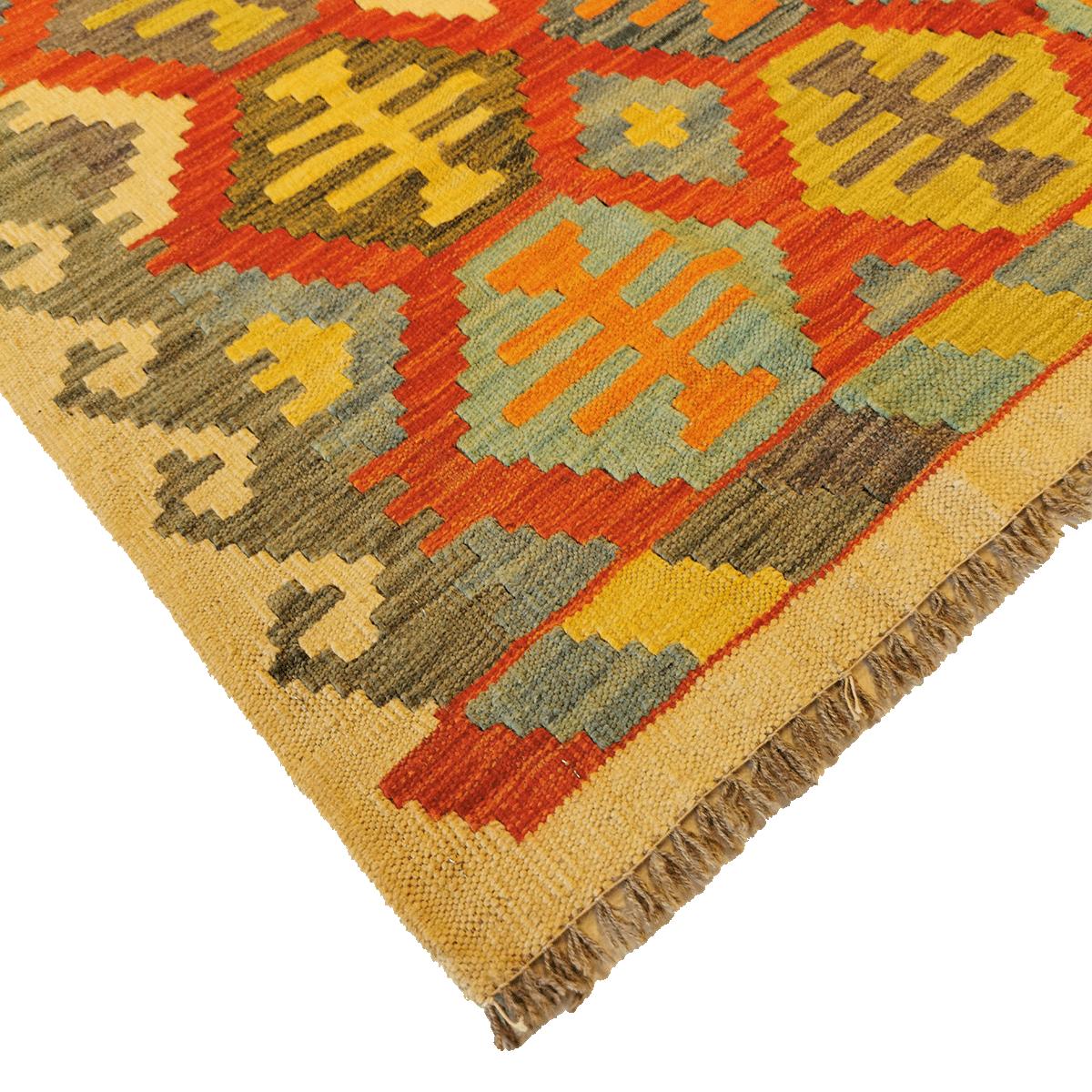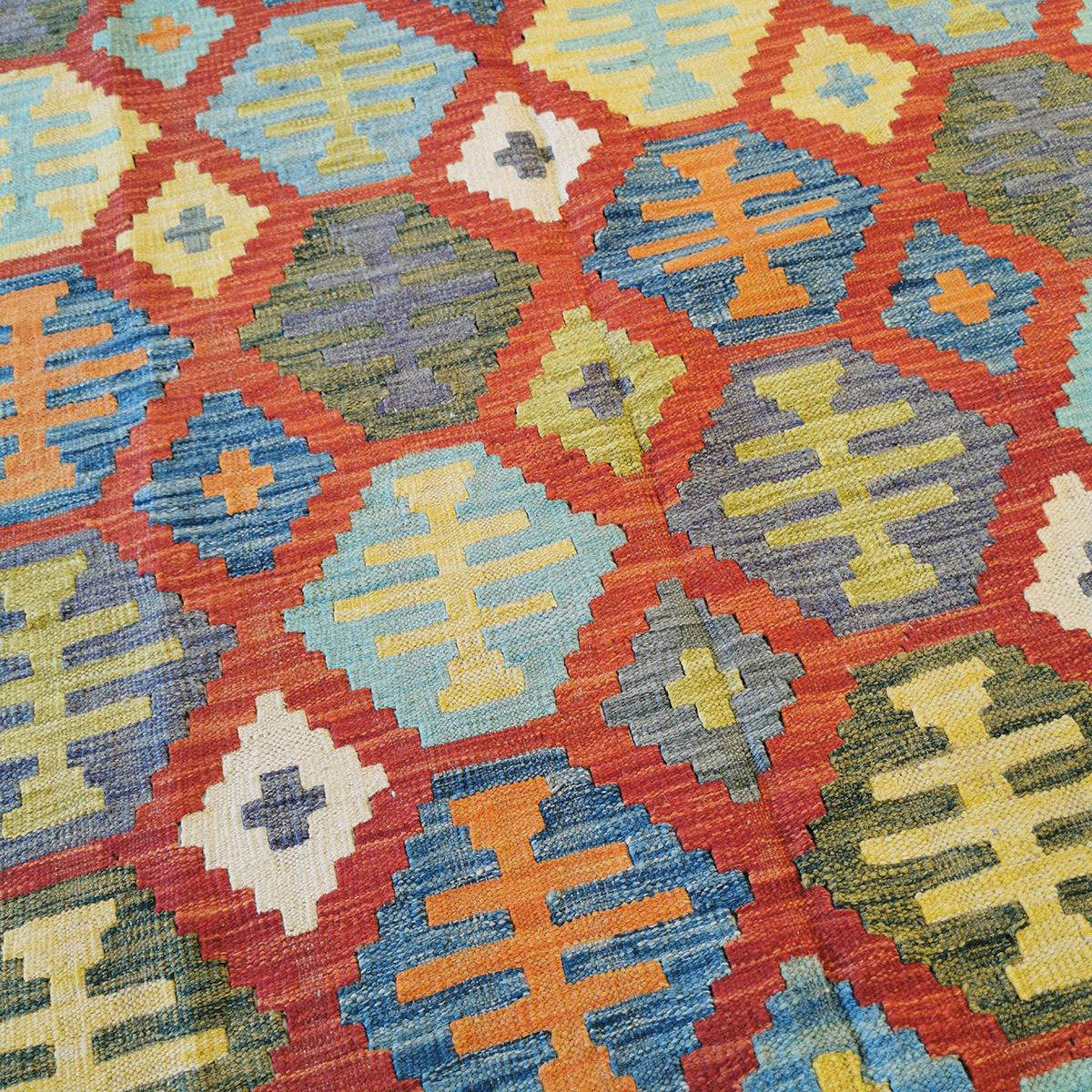 Afghanske kelimer er håndvevde tepper med sterke, geometriske mønstre og rike farger. De lages tradisjonelt i Afghanistan, ofte av ull, og har en karakteristisk flatt vevd struktur uten lugg. Mønstrene kan variere fra enkle design til mer intrikate motiver, og kelimene er kjent for sin rustikke, autentiske stil som passer godt inn i både tradisjonelle og moderne interiør. Disse kelimene er vendbare og kan brukes på begge sider.