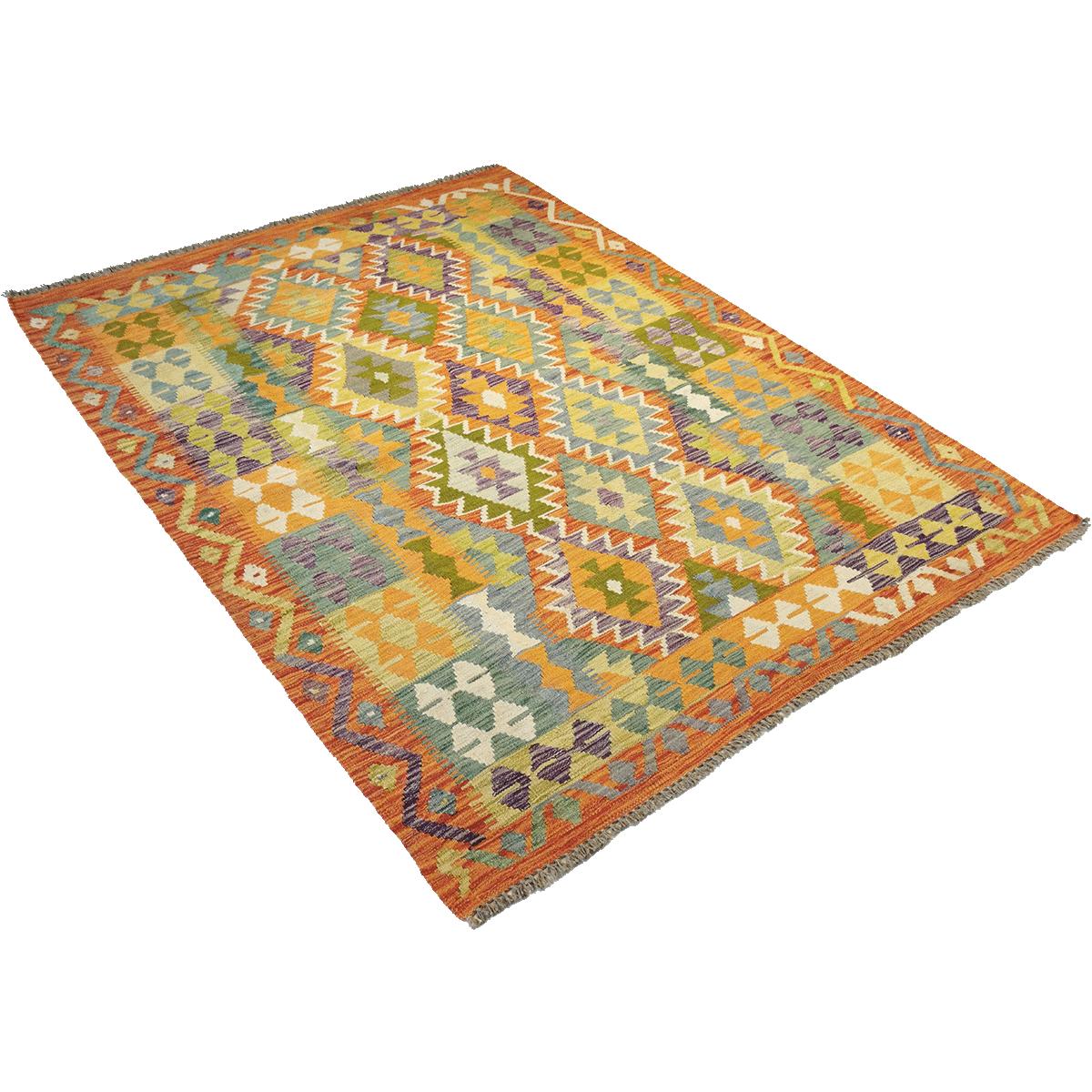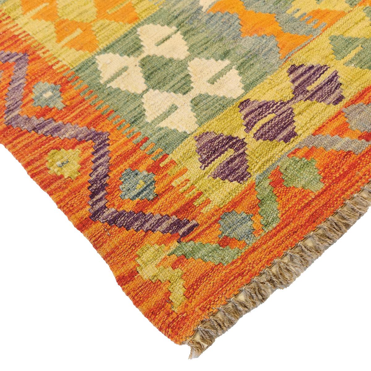 Afghanske kelimer er håndvevde tepper med sterke, geometriske mønstre og rike farger. De lages tradisjonelt i Afghanistan, ofte av ull, og har en karakteristisk flatt vevd struktur uten lugg. Mønstrene kan variere fra enkle design til mer intrikate motiver, og kelimene er kjent for sin rustikke, autentiske stil som passer godt inn i både tradisjonelle og moderne interiør. Disse kelimene er vendbare og kan brukes på begge sider.