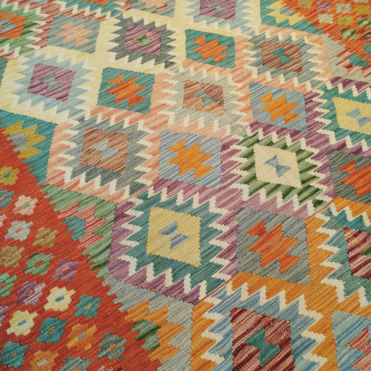 Afghanske kelimer er håndvevde tepper med sterke, geometriske mønstre og rike farger. De lages tradisjonelt i Afghanistan, ofte av ull, og har en karakteristisk flatt vevd struktur uten lugg. Mønstrene kan variere fra enkle design til mer intrikate motiver, og kelimene er kjent for sin rustikke, autentiske stil som passer godt inn i både tradisjonelle og moderne interiør. Disse kelimene er vendbare og kan brukes på begge sider.