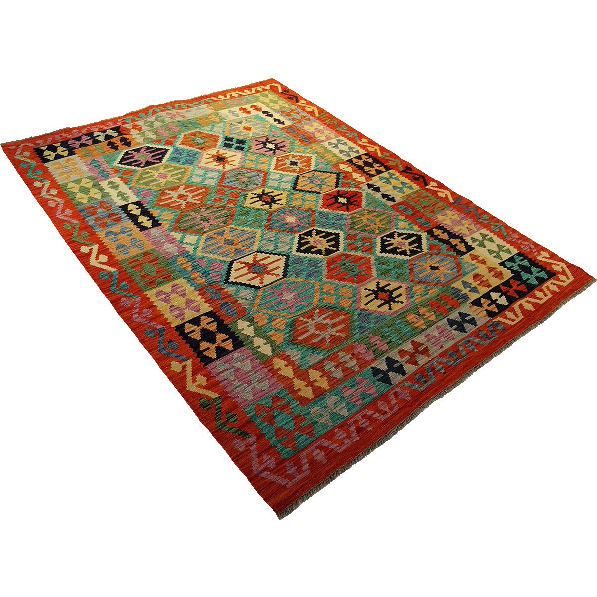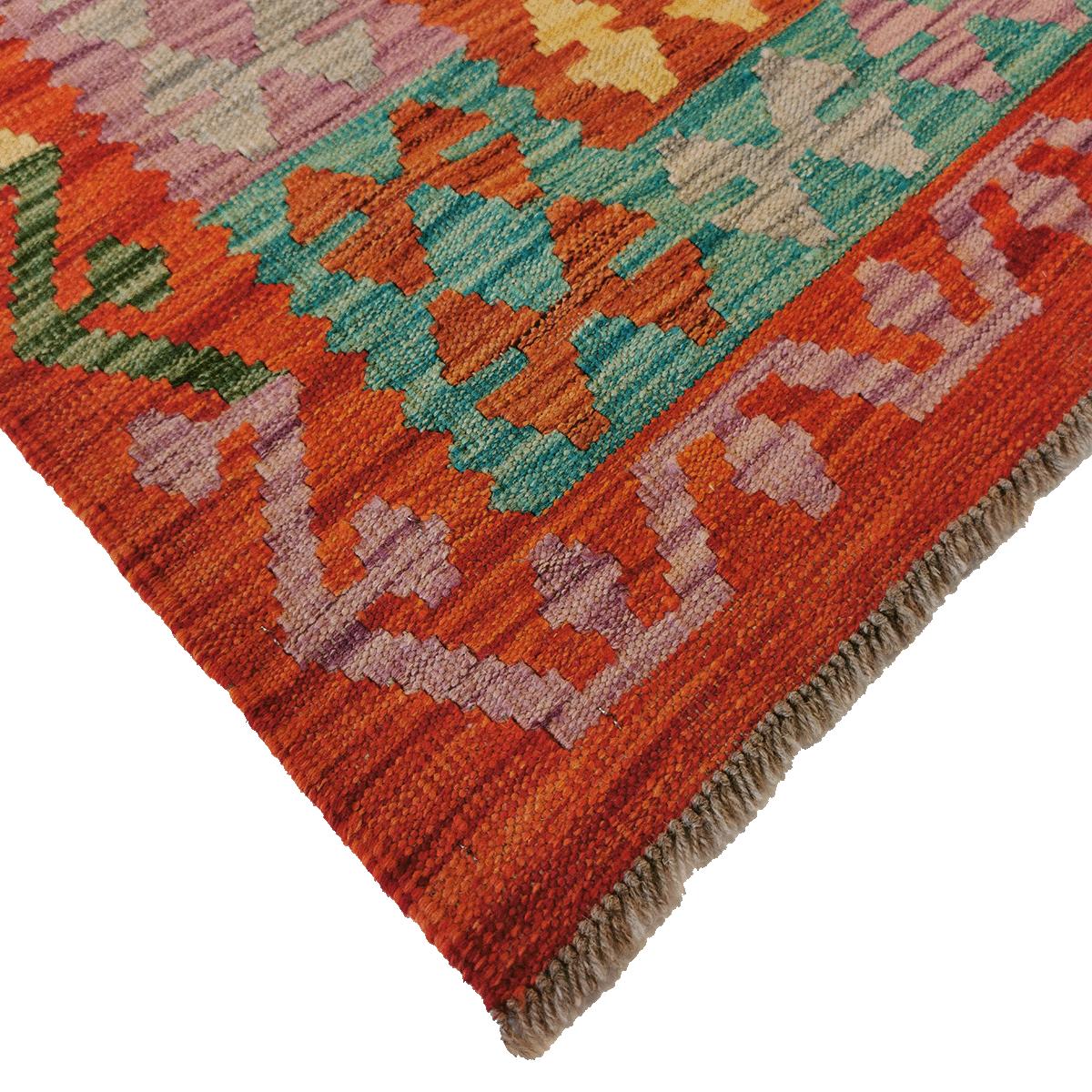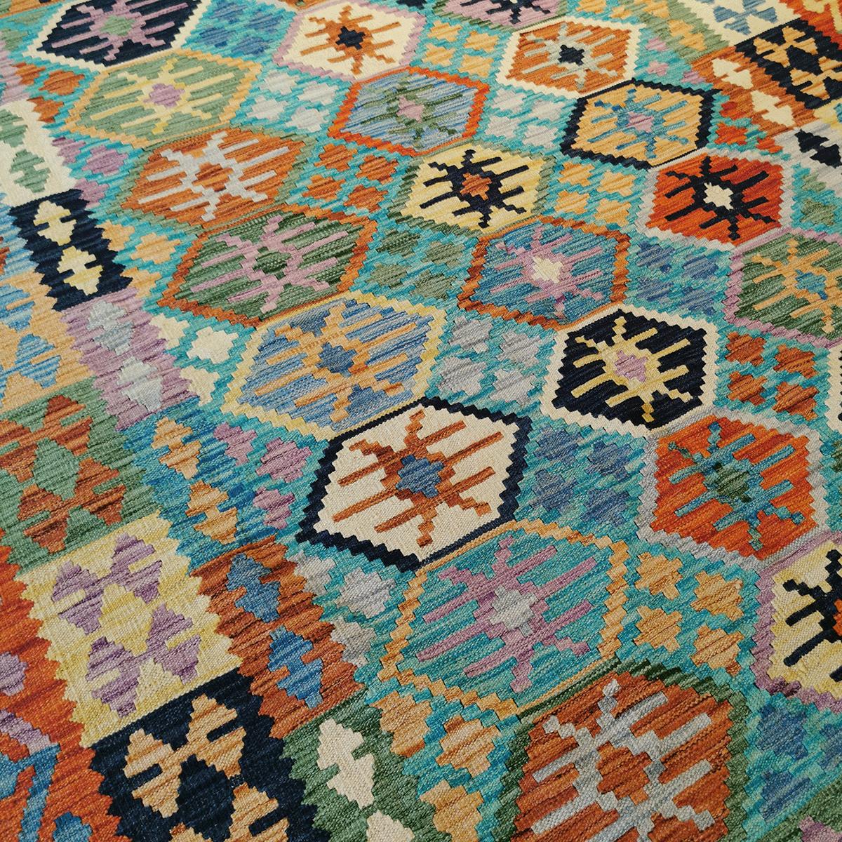 Afghanske kelimer er håndvevde tepper med sterke, geometriske mønstre og rike farger. De lages tradisjonelt i Afghanistan, ofte av ull, og har en karakteristisk flatt vevd struktur uten lugg. Mønstrene kan variere fra enkle design til mer intrikate motiver, og kelimene er kjent for sin rustikke, autentiske stil som passer godt inn i både tradisjonelle og moderne interiør. Disse kelimene er vendbare og kan brukes på begge sider.