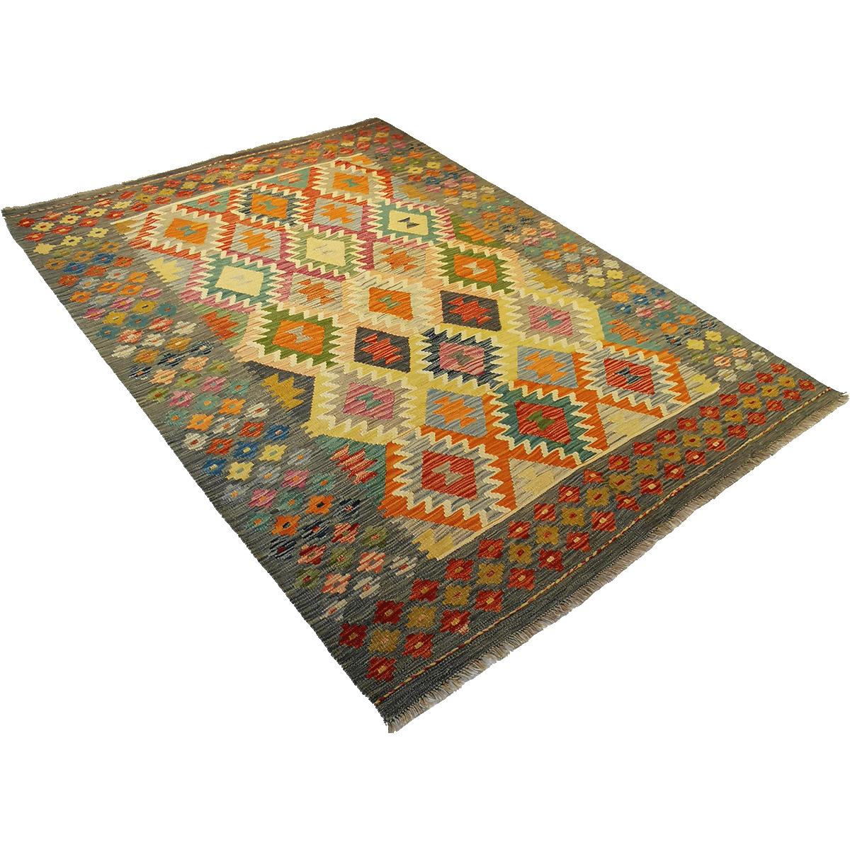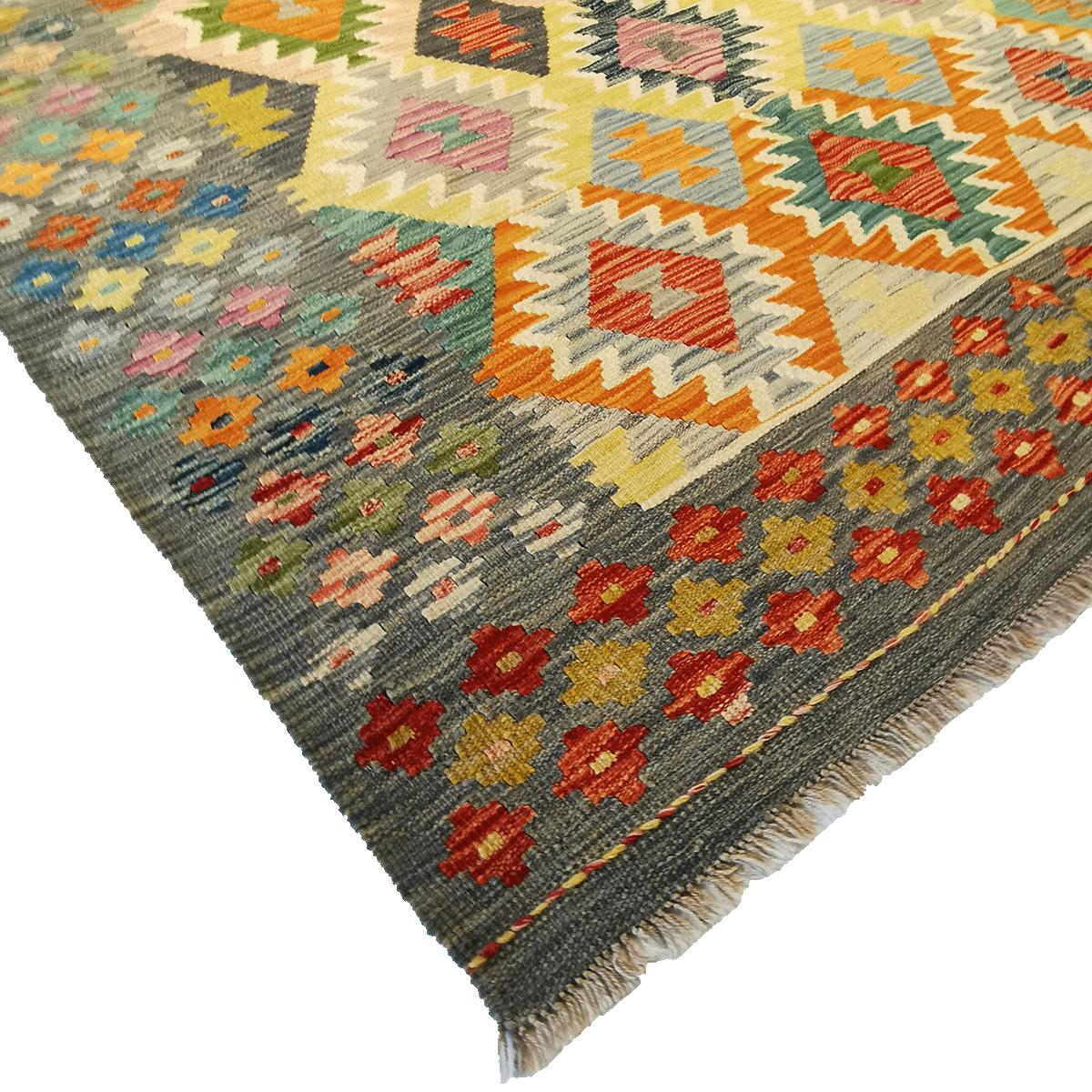 Afghanske kelimer er håndvevde tepper med sterke, geometriske mønstre og rike farger. De lages tradisjonelt i Afghanistan, ofte av ull, og har en karakteristisk flatt vevd struktur uten lugg. Mønstrene kan variere fra enkle design til mer intrikate motiver, og kelimene er kjent for sin rustikke, autentiske stil som passer godt inn i både tradisjonelle og moderne interiør. Disse kelimene er vendbare og kan brukes på begge sider.