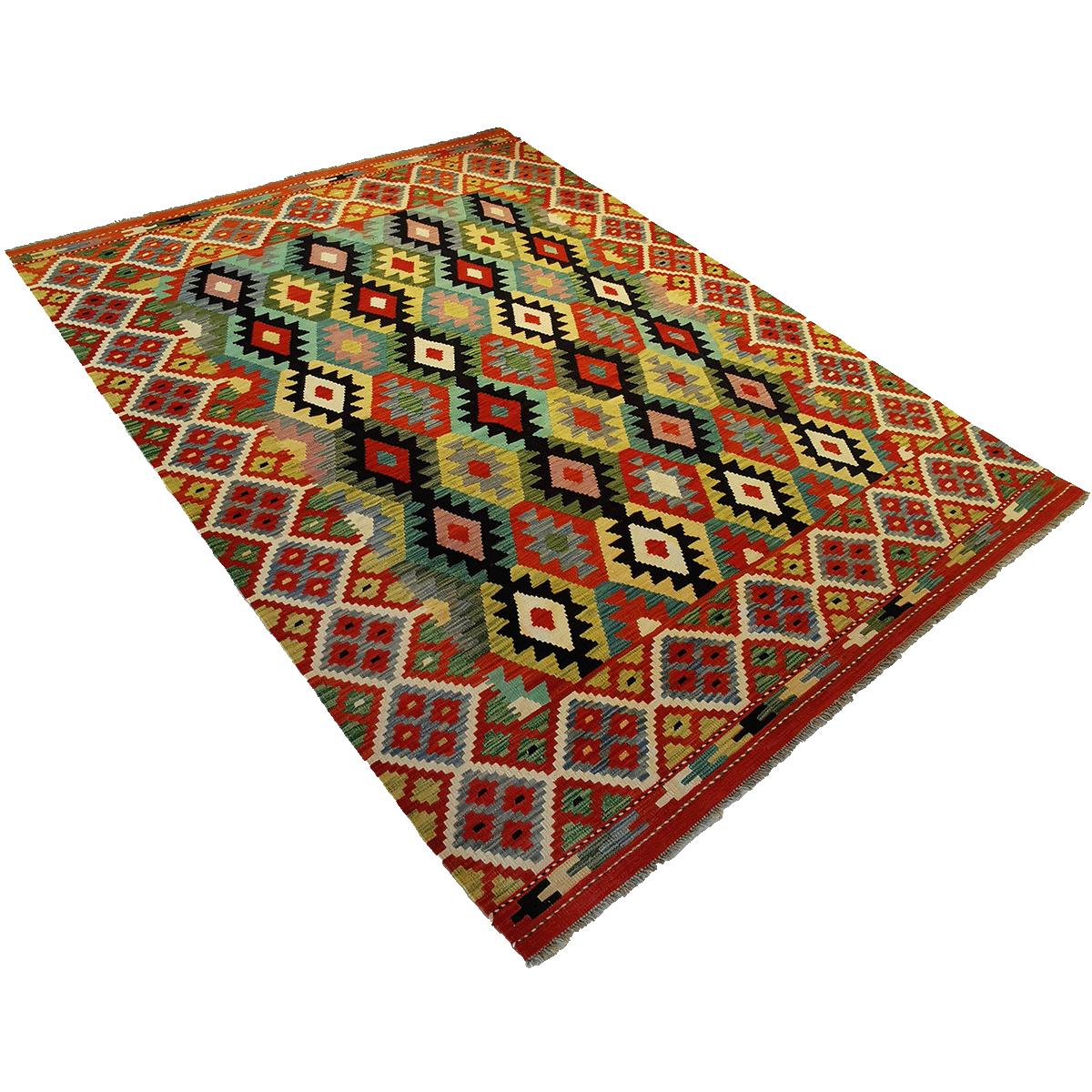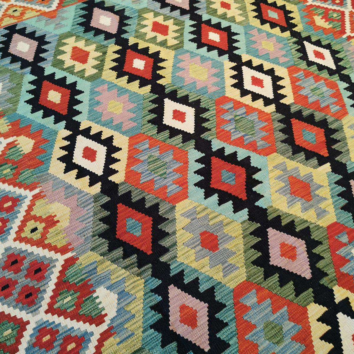 Afghanske kelimer er håndvevde tepper med sterke, geometriske mønstre og rike farger. De lages tradisjonelt i Afghanistan, ofte av ull, og har en karakteristisk flatt vevd struktur uten lugg. Mønstrene kan variere fra enkle design til mer intrikate motiver, og kelimene er kjent for sin rustikke, autentiske stil som passer godt inn i både tradisjonelle og moderne interiør. Disse kelimene er vendbare og kan brukes på begge sider.