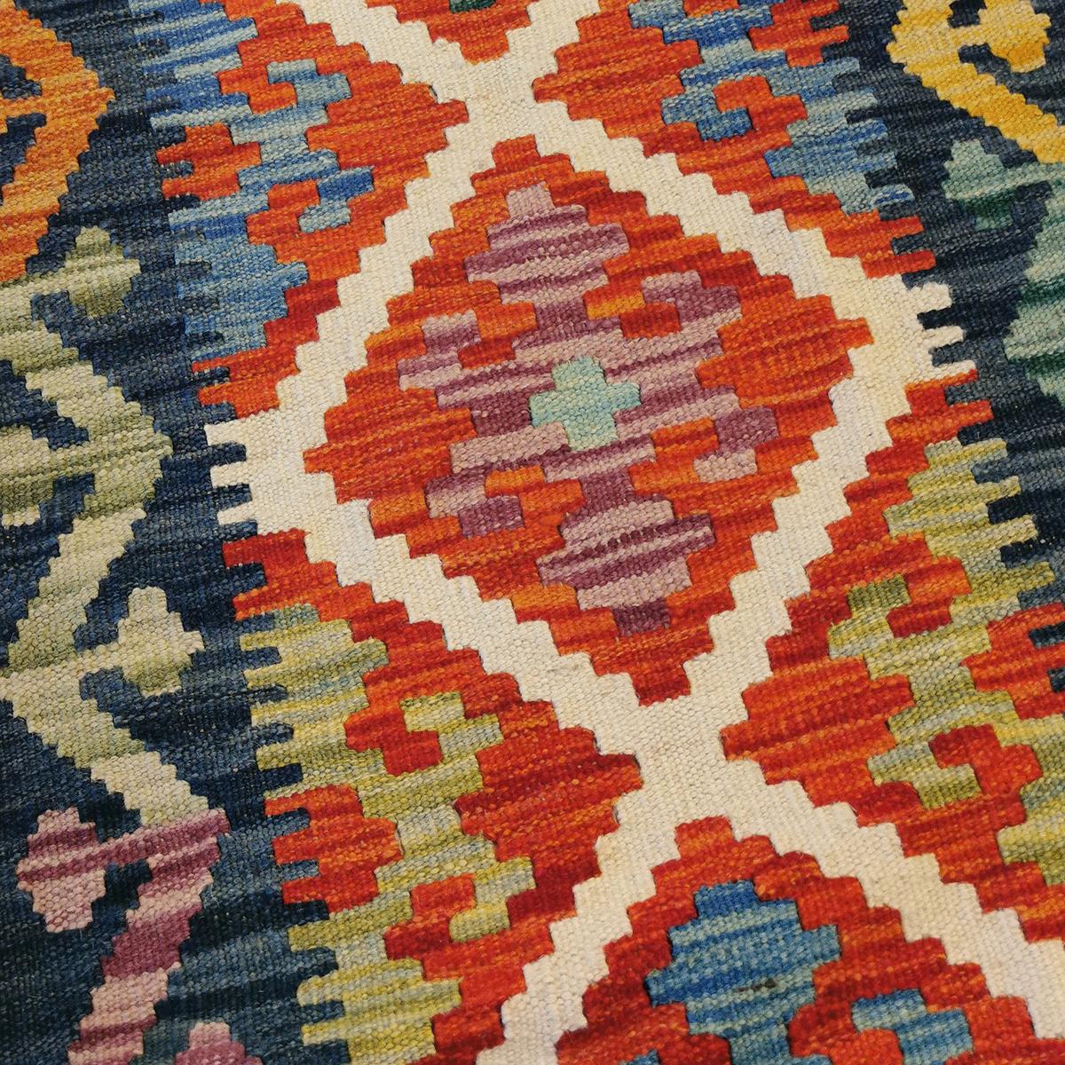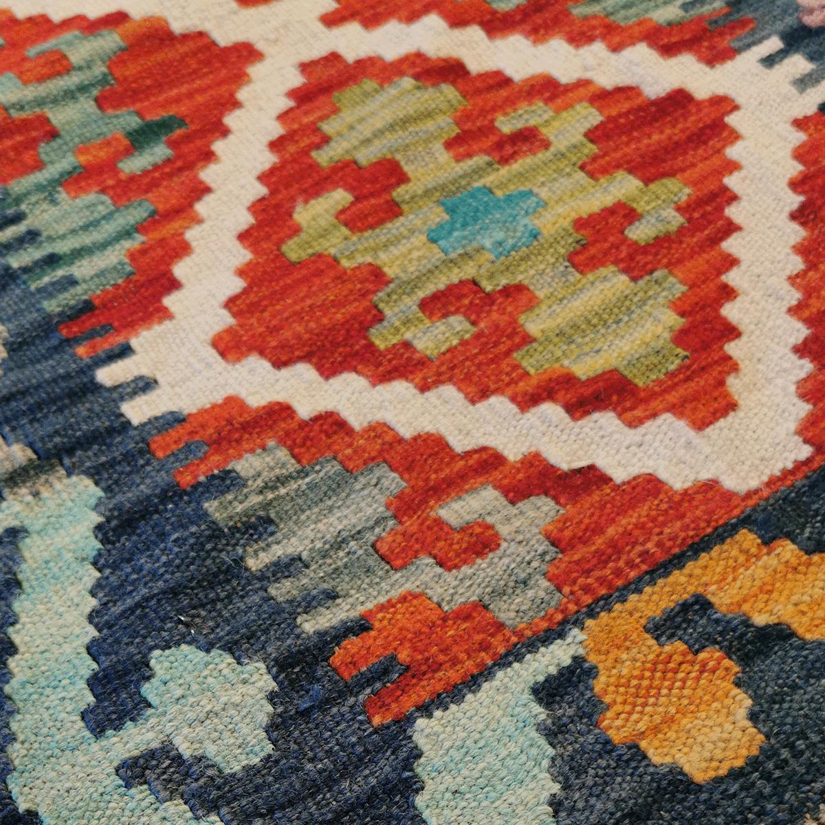 Afghanske kelimer er håndvevde tepper med sterke, geometriske mønstre og rike farger. De lages tradisjonelt i Afghanistan, ofte av ull, og har en karakteristisk flatt vevd struktur uten lugg. Mønstrene kan variere fra enkle design til mer intrikate motiver, og kelimene er kjent for sin rustikke, autentiske stil som passer godt inn i både tradisjonelle og moderne interiør. Disse kelimene er vendbare og kan brukes på begge sider.