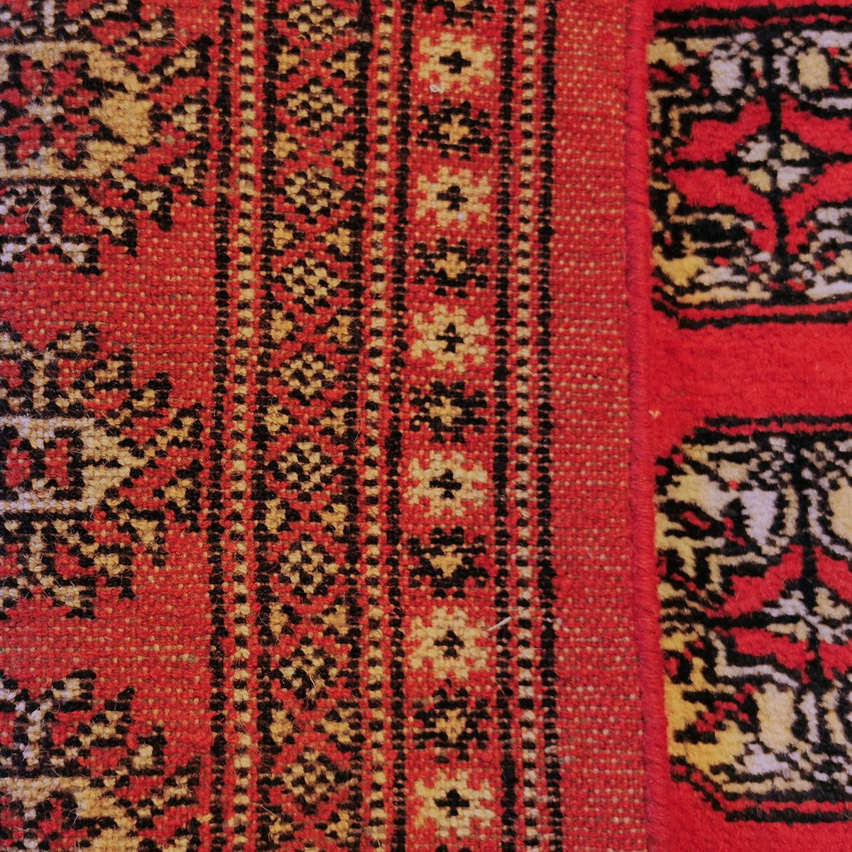 Pakistanske Bokhara-tepper er kjent for sitt unike og verdenskjente elefantfot-mønster, som tilfører et tidløst og sofistikert preg til ethvert rom. Dette vakre mønsteret, kombinert med elegante geometriske detaljer, skaper et harmonisk design som appellerer til både klassiske og moderne interiører. Teppene er laget av ull av høy kvalitet, som gir en naturlig glans og en myk, behagelig tekstur. Den tette knyttingen sørger for en imponerende slitestyrke, noe som gjør Bokhara-teppene til både et visuelt og praktisk valg for varige, elegante rom.