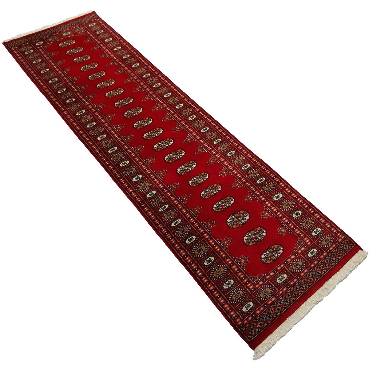 Pakistanske Bokhara-tepper er kjent for sitt unike og verdenskjente elefantfot-mønster, som tilfører et tidløst og sofistikert preg til ethvert rom. Dette vakre mønsteret, kombinert med elegante geometriske detaljer, skaper et harmonisk design som appellerer til både klassiske og moderne interiører. Teppene er laget av ull av høy kvalitet, som gir en naturlig glans og en myk, behagelig tekstur. Den tette knyttingen sørger for en imponerende slitestyrke, noe som gjør Bokhara-teppene til både et visuelt og praktisk valg for varige, elegante rom.