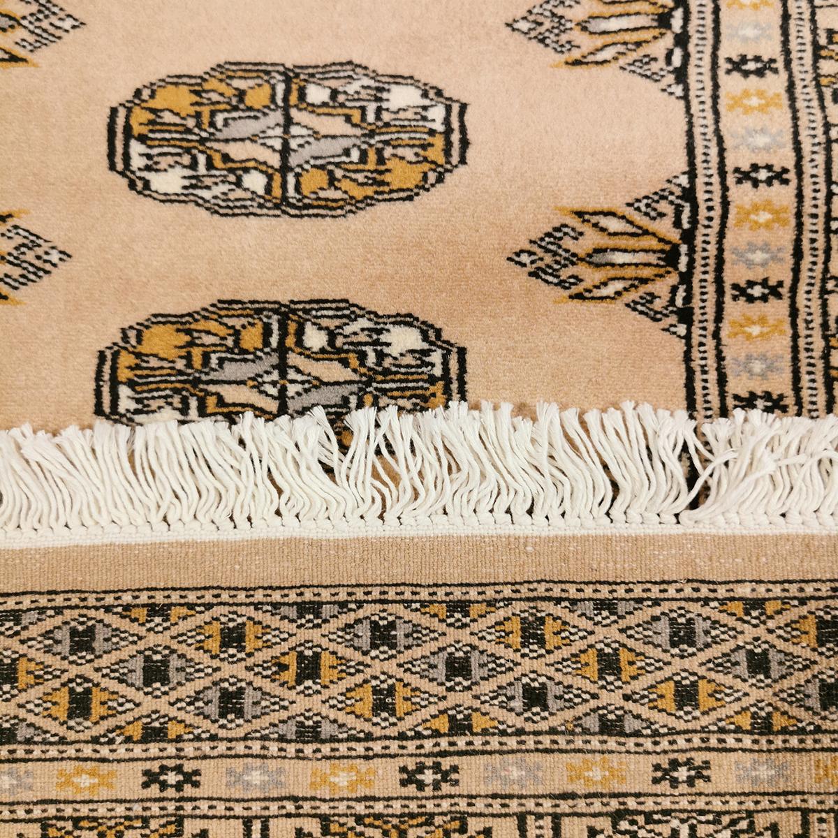 Pakistanske Bokhara-tepper er kjent for sitt unike og verdenskjente elefantfot-mønster, som tilfører et tidløst og sofistikert preg til ethvert rom. Dette vakre mønsteret, kombinert med elegante geometriske detaljer, skaper et harmonisk design som appellerer til både klassiske og moderne interiører. Teppene er laget av ull av høy kvalitet, som gir en naturlig glans og en myk, behagelig tekstur. Den tette knyttingen sørger for en imponerende slitestyrke, noe som gjør Bokhara-teppene til både et visuelt og praktisk valg for varige, elegante rom.